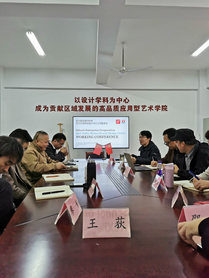 最后,各系主任简要介绍了各专业的发展情况,卢利波老师介绍了实训中心的情况以及以往校企合作的成功经验,在软件和硬件方面提出了双方合作更多地可能性。各位与会骨干教师也纷纷表态,一定不遗余力,以最大的热情投入到合作中。“巨日太湖研创设计中心”的发展融合了设计学、机械工程学、物联网工程学、计算机科学技术等大学科的项目研发设计实验,规划校企合作共建巨日装备协同艺术学院、智能装备工程学院、物联网工程学院的系统研创团队。项目初期以艺术学院副院长朱宗明教授为设计中心运行督导的乙方责任主体,由甲方派驻2名工程师为合作项目的研发执行总指导,开展合同项下研发工作。