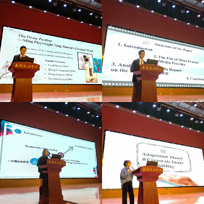 接下来是比赛环节,陈子豪同学和孔浩同学通过bilibili网站的案例来分析直播时虚拟身份的现状;齐艺博同学通过对日本版花木兰海报各个部位的解读,并与韩国版、美国版的海报进行对比,浅析角度的选择在设计中的重要作用;张力文同学以单口相声为切入点,简单介绍其起源和发展,接着从合作原则的角度来看单口相声对美国政府疫情应对措施的解构,他生动的演讲着实让人感觉妙趣横生;张力淞同学从认知隐喻视角对《牡丹亭》文化意象的翻译策略进行研究,向同学们展示了深厚的国学功底和在翻译上的独特见解。