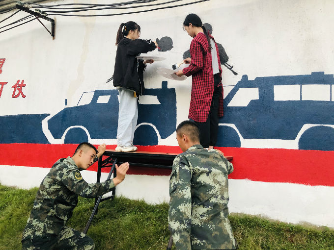 为了号召习主席所提倡的努力推进部队文化建设,贯彻落实这一重要指示,就要大力推进军营文化建设创新发展。经过了艺术学院服务岗和大池路军区领导的联络沟通之后。当天正午,艺术学院服务岗的同学们来到了大池路军区进行一次文化墙绘志愿服务活动。也可以正面反应强调出青年一代有理想、有本领、有担当,国家就有前途,民族就有希望。