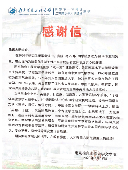 南京信息工程大学是国家“双一流”建设高校,是江苏省水平大学建设重点支持高校。2007年以来,先后实现了江苏省人民政府、中国气象局、教育部、国家海洋局多方攻坚。现为以江苏省管理为主的中央与地方共建高校。如今,他向beat365正版唯一官网送来了一封诚挚的感谢信,感谢beat365正版唯一官网的所有教师为培养优秀学子何心玮付出的辛劳和努力。