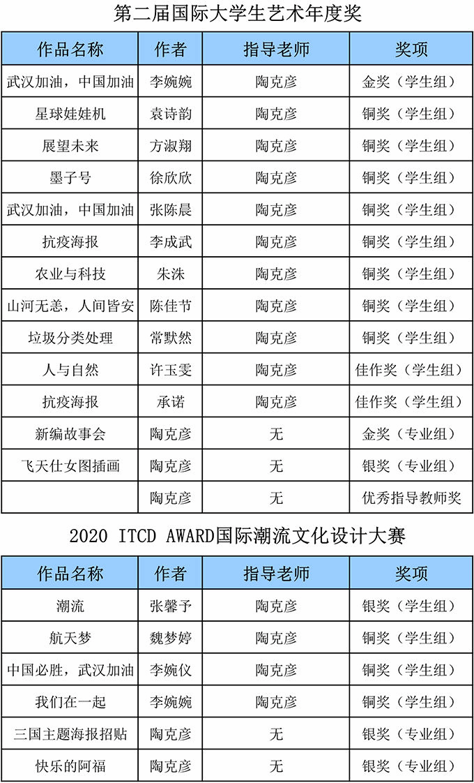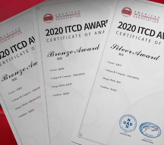 第二届国际大学生艺术年度奖由台北市政府教育局发起主办,是主要面向中国大陆地区、中国台湾地区、中国香港澳门地区及新加坡地区的一项国际性设计大赛。大赛旨在进一步推动中华传统文化的创造性以及应用性的发展,并充分调动海峡两岸暨港澳、新加坡等地大学生及优秀设计师的创意热情,共同发挥创意思维及设计手段將传统文化、当代文化、当代艺术用新思维艺术形式进行更加科学的传播,弘扬、传承和创新中华优秀传统文化。2020 ITCD AWARD国际潮流文化设计大赛是由AACA美国艺术交流学会主办POPARTCN、秦皇岛波普艺术中心承办,北美高校设计联盟(NAUD)指导举办的当代潮流艺术文化设计大赛,大赛是通过对艺术的理解加以转化为潮流的时尚设计,通过潮流文化带动设计的新研究,为当代的艺术发展提供一个专业的思考维度。