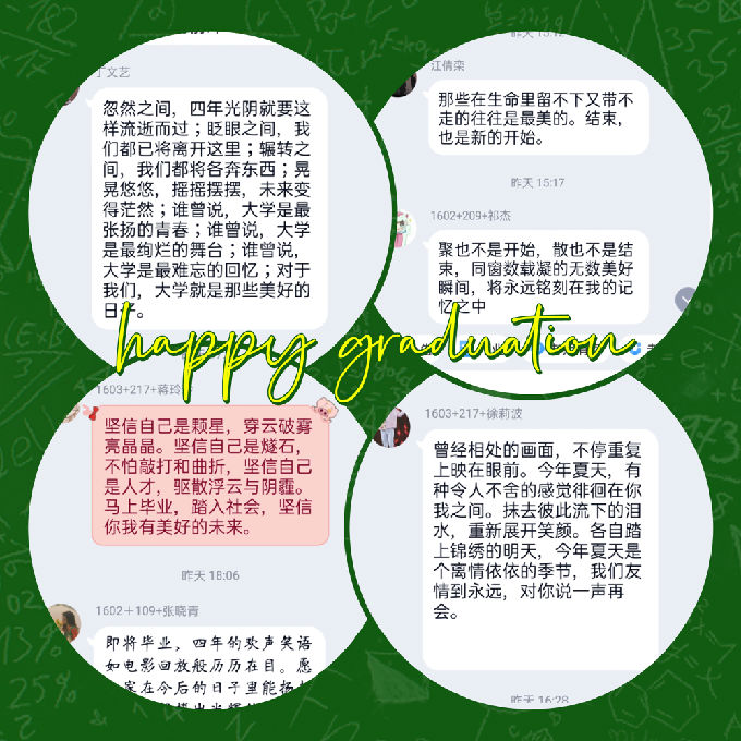 “梧桐叶上三更雨,叶叶声声是别离”。别离,是这个季节的主题,追梦,便是再次相聚的灯塔,牵挂,源于美好。四年来,你们的点滴成长成了我最深的记忆,无法阻止这四年的结束,虽然不能陪你们继续前行,但你们将是我永恒的牵挂。你们即将迎来崭新的生活,即将远离我的絮絮叨叨,即将奔上新的征程。相信优秀的你们,一定会更加优秀!