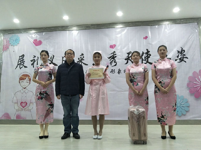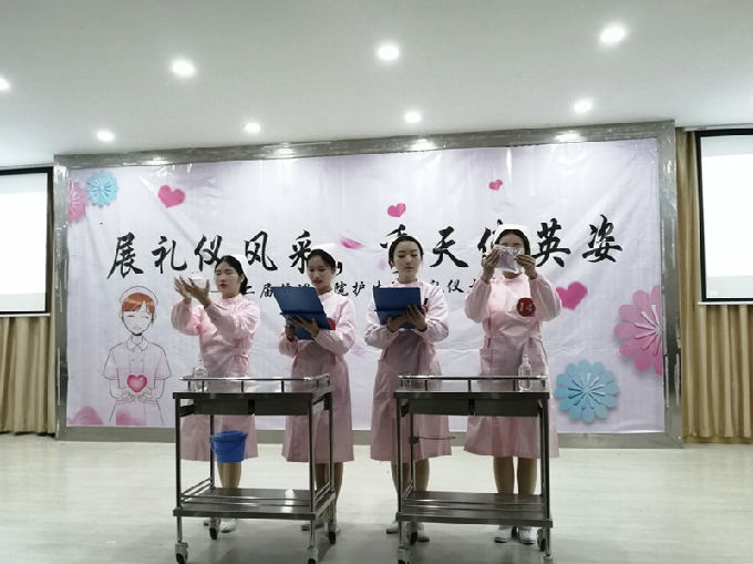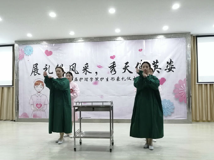 赛程过后,主持人邀请了两位观众上台学习护理礼仪,希望可以培养同学们文明、诚信、有礼貌的良好形象,弘扬护理礼仪风采。