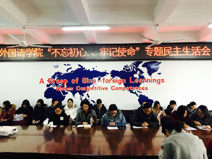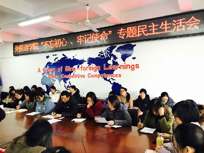 12月5日中午,外国语学院党总支在学院二楼会议室211召开了“不忘初心、牢记使命”专题民主生活会。本次民主生活会主要围绕党员批评与自我批评展开,由董书记主持,全体党员及预备党员均到会参加。