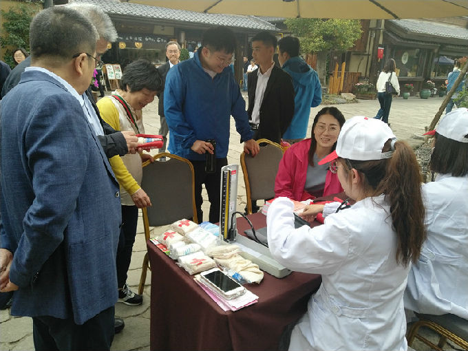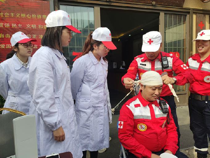 此外,为锻炼志愿们的实践操作能力,志愿者们还为民众进行了测量血压,宣讲预防高血压的医学知识。为进一步增加志愿者们对红十字会工作的认识,志愿者们与红十字协会相关人员进行学习相关的急救操作知识训练,在工作人员的细心教导下,志愿者们进行了心脏复苏,头部包扎等急救操作的训练。整个训练氛围浓厚,游客纷纷对志愿者们表示肯定和赞赏。