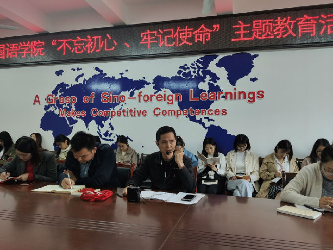 11月6日中午,外国语学院教师党支部、教工党支部、学生党支部在二楼会议室召开了“不忘初心、牢记使命”主题教育集中学习研讨会。会议议程共分为两大部分,分别为各党支部书记带头检视问题进行汇报及各支部党员前往国政馆重温入党誓词。会议由党总支副书记俞昊波主持。