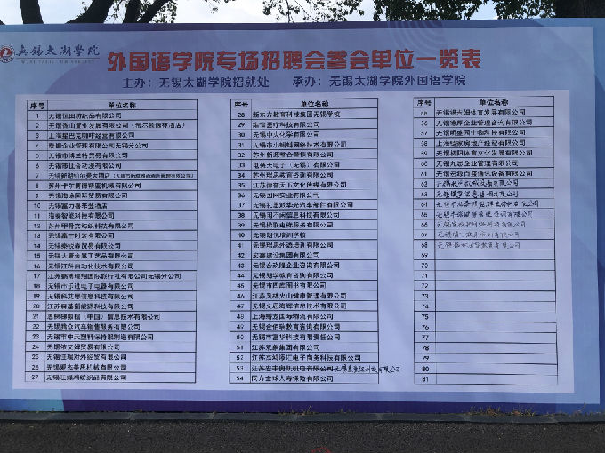 10月16日,由beat365正版唯一官网招就处主办、外国语学院承办的外国语学院2019秋季校园专场招聘会在6号楼大学生事务发展中心北广场圆满举办。外国语学院就业工作领导小组所有成员到场与企业进行交流。我院通过评估整改全力打造“外语+专业”的复合型人才培养模式。本次招聘会邀请了瑞银企业管理有限公司无锡分公司、上海星巴克咖啡经营有限公司、新东方教育科技集团无锡学校等70余家企业到场参会,为我院应届毕业生提供更便捷的求职机会,搭建毕业生与用人单位良好的交流平台,积极为用人单位输送应用型人才。