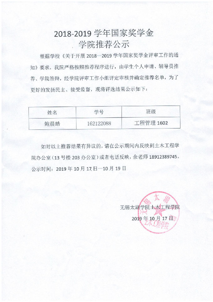 为了进一步完善规范“国家奖学金”评选方式,更加体现公开、公平、择优、透明的原则,营造比学赶超先的良好氛围,激励广大学生发奋学习、全面发展、立志成才。根据学校《关于开展2018-2019学年国家奖学金评审工作的通知》要求,10月17日下午,土木工程学院在13号楼210会议室举行了2018-2019学年国家奖学金答辩会,此次答辩会经学生主动申请,辅导员严格把关,共有四名同学参加,他们分别是工程管理1602班级的鲍晨皓同学、工程管理1702班级的赵赛河同学、土木工程1701班级的贾茹同学以及工程管理1802班级的眭静怡同学,在这四名同学中择优推荐一人参加学校国家奖学金差额评审公开展示会。土木工程学院党总支副书记余波、学工秘书朱敏以及各年级辅导员担任此次答辩会的评委。