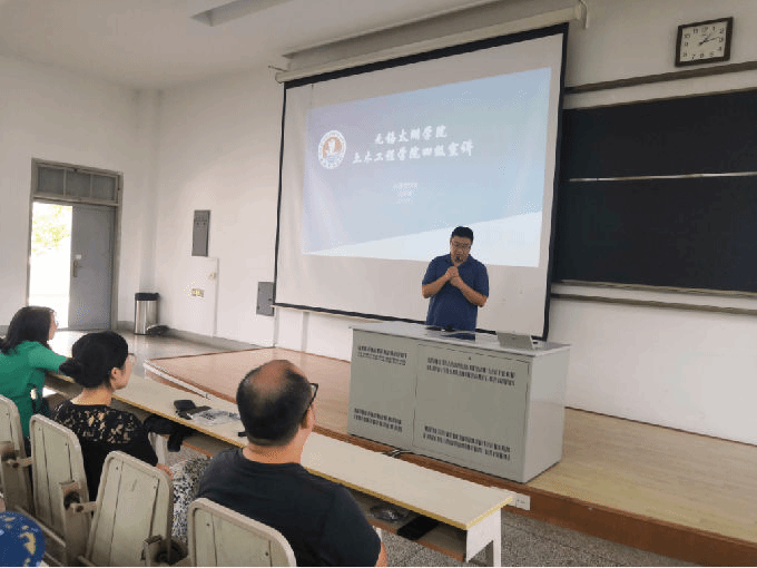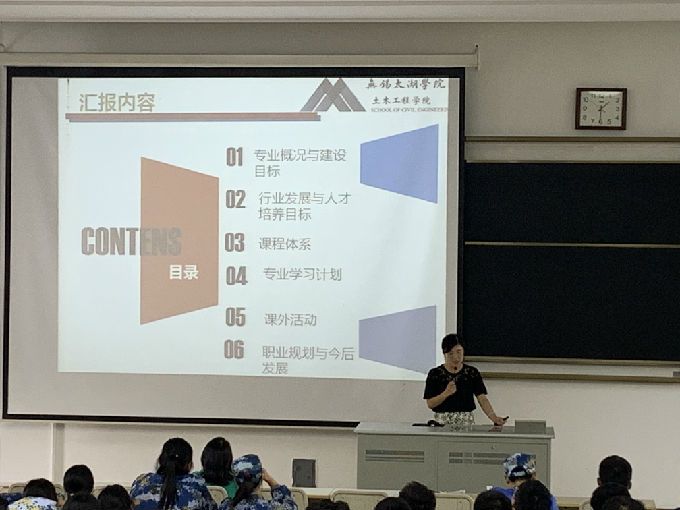 大学英语教研室花荣臻老师,计算机中心丁艳秋老师,土木工程学院毕远志教授,土木工程专业系副主任贺方倩老师,工程管理专业系副主任方周妮老师,2019级新生辅导员钱紫云老师共同出席了此次介绍会,学院2019级全体新生参会。本次会议由土木工程学院党总支副书记余波主持。