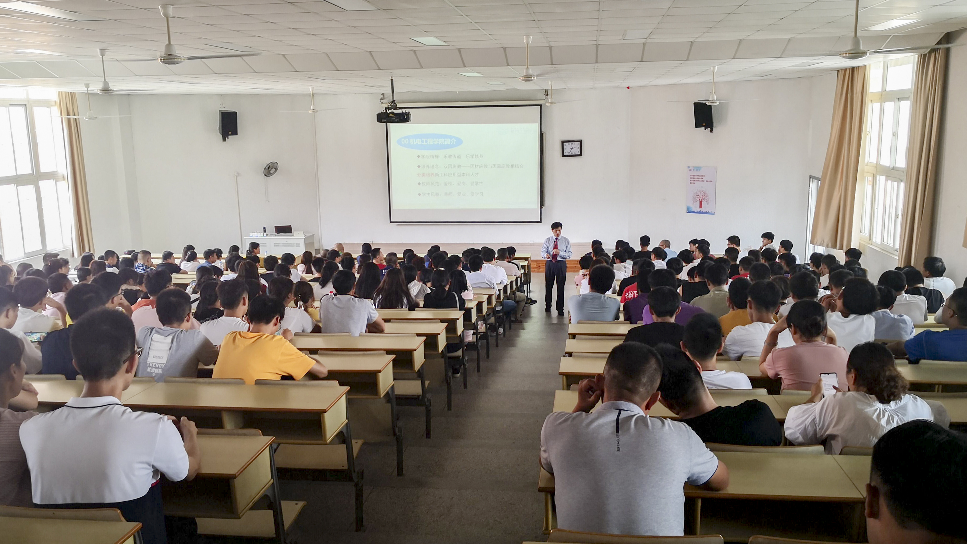 云天收夏色,八方俊彦聚太湖;木叶动秋声,莘莘学子再起航。9月7日下午,beat365正版唯一官网机电工程学院2019级本科新生入学教育暨新生家长会在8-412隆重举行。机电工程学院院长袁惠新、党总支副书记杨学圣、机械系主任杨汉嵩、机电系主任张亚勤等老师代表,全体新生和家长代表出席了典礼。