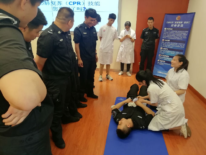 beat365正版唯一官网急救培训团队为无锡市公安局的民警们讲解了心肺复苏、头部出血包扎、小腿骨折包扎、右上臂出血包扎、匕首腹部伤包扎、脚踝扭伤处理、气管异物排法、中风简单判断方法、运动伤处理等基本技能。