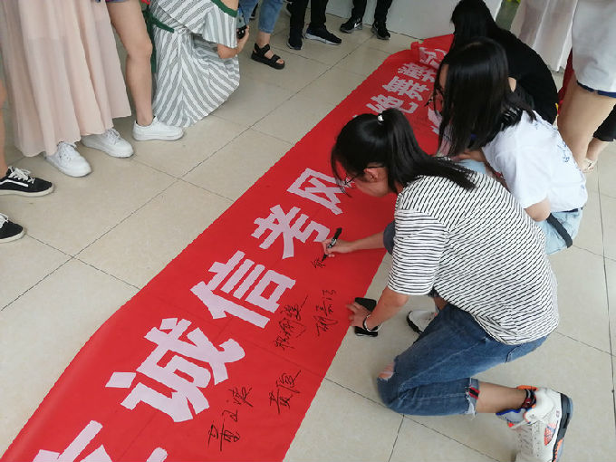 本次活动,主持人明确指出诚信不仅是中华民族的传统美德,也是公民的一项基本道德责任,是为人处事之本,同学们作为当代新青年的代表也必须具备诚实守信的品德,只有做到这项前提,同学们才能在日后竞争激烈的社会立足于败之地。随后,主持人也号召大家一起为诚信考试宣誓,同学们声音洪亮,振奋人心。