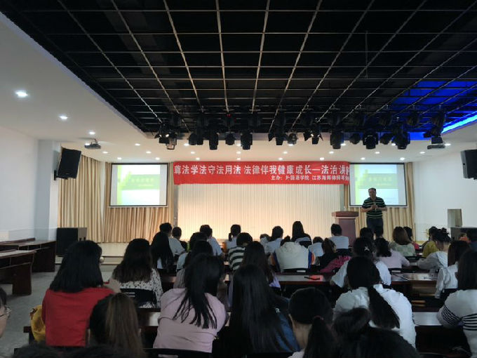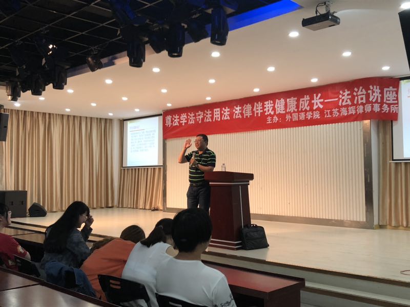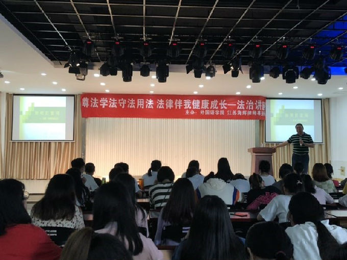 5月17日下午,外国语学院“尊法学法守法用法 法律伴我健康成长”法治讲座于大学生活动中心B成功开展。本次法治主题讲座由江苏海辉律师事务所党支部副书记、劳动法业务部部长许雪松律师主讲,外国语学院党总支副书记俞昊波、学工秘书姚靓雯及各年级学生代表共同参加此次讲座。