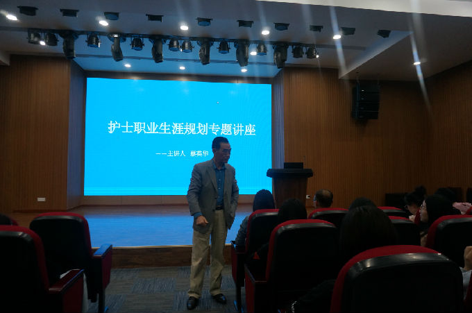 蔡主任一到场就受到了全场数百人的热烈欢迎,同学们对职业生涯规划也表现出了极大的热情和浓厚的兴趣。蔡主任首先向大家简单介绍了自己,并开门见山地介绍了目前护理专业的现状,将国内外护士进行了鲜明的对比,表明国内护士未来发展前途无限。接着对在场同学提问“什么是护理?”让大家带着问题去听讲座,然后蔡主任提出了21世纪护理人员的主要任务,还分析了目前社区护理人员所涉及的慢病管理、居家护理以及出院后的延续性护理的发展趋势,让同学们深刻认识到护理工作的多样化和重要性。随后蔡主任从我国专科护士的发展现、护士生涯发展与分层管理、护理工作的专业和行政发展方向等多个方面传授了宝贵的知识与经验,并且耐心地为同学们的疑问做出解答。现场反响积极,气氛热烈。
