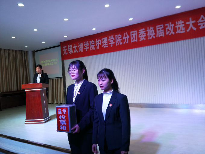 大会监选组从大会主席团分别领取选票,当场向在座代表示意保密文件、并检验票箱开箱以示代表,检验无问题后封箱,以保证投票公正透明。现场工作人员从监选组分别领取选票并分发给在座学生代表,学生代表填选完毕后依次进行投票,第一轮投票产生新一届护理学院分团委副书记一职。