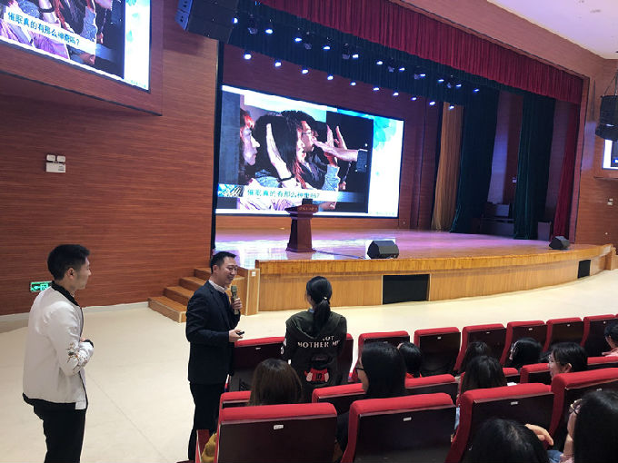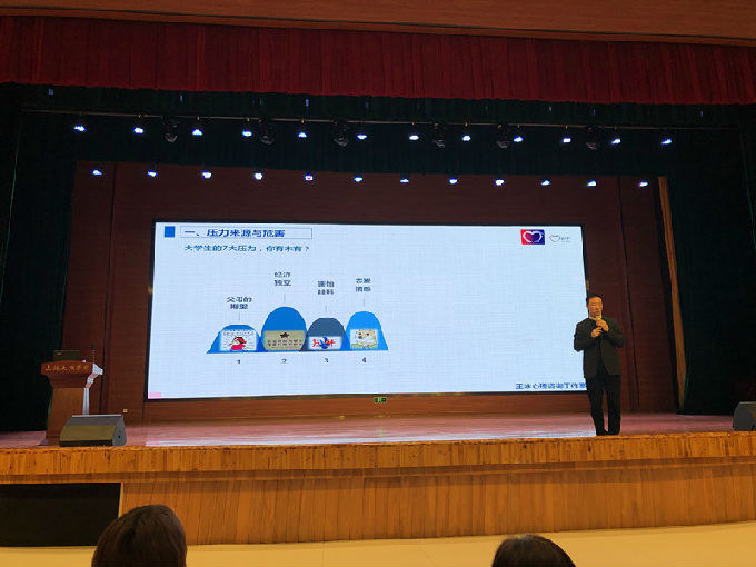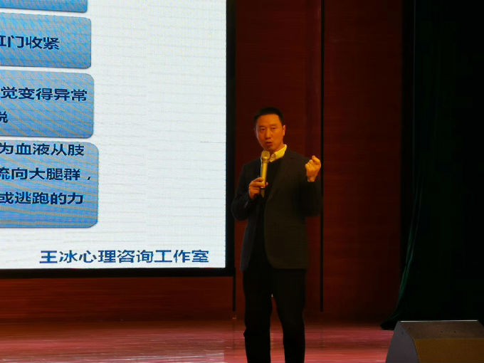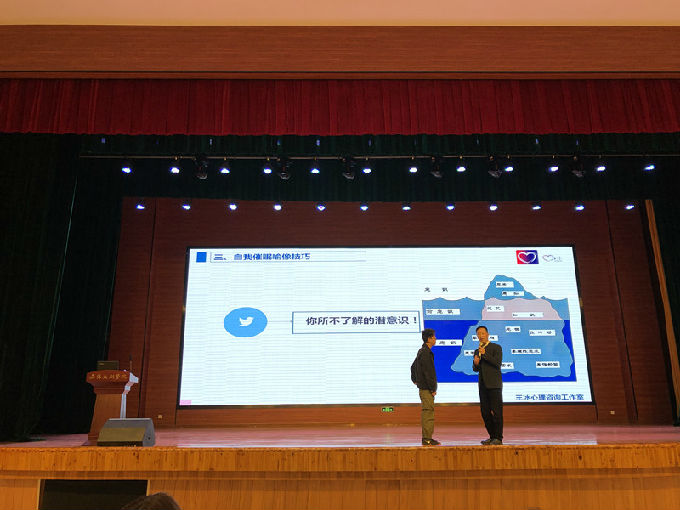 王冰主任以“越‘压’越有力”为题向在场人员讲解如何调整自我抗压能力。讲座伊始,由王主任带领大家用手指做了项小游戏,在轻松愉悦的氛围中集中大家的注意力。以猜一猜“我是谁”的方式结合亲身经历让大家了解他。为了介绍科学催眠,他给大家播放了他曾在新闻采访现场催眠试验者的视频。视频中,王主任将若干名试验者成功催眠,展现了科学催眠神奇的魔力。催眠是指催眠师向被试提供暗示,以唤醒他的某些特殊经历和特定行为。许多心理学家认为,催眠与其他一般状态是相似的,包括放松、全神贯注和联想。在催眠状态下,一个人可能经历“在感知、思维、记忆和行为上的一些改变”,包括暂时的麻痹、幻觉和忘记“对催眠术医师的暗示做出反应”。催眠是在唤起自身的潜意识。