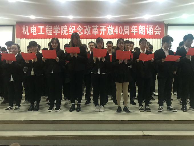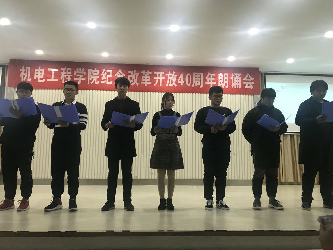 11月23日晚六点,机电工程学院纪念改革开放四十周年朗诵会在大学生活动中心隆重举行。担任此次朗诵会的评委有:原中央人民广播电台中华之声播音员,现任无锡市主持人协会副会长秦子鸿先生、机电工程学院分团委书记许心怡老师、学工秘书邓珂老师、2018级辅导员王明鑫老师。机电工程学院16-18级各班均组建团队参与此次朗诵活动。