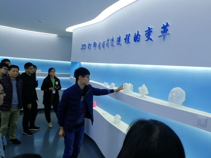 随后在李飞副总经理的带领下,同学们参观了交大增智增材制造技术研究院有限公司的成果展厅,并了解到了3D打印在文物修理、航空航天、汽车工业、电子电器、生物医疗、文创教育等领域的应用和现状,以及无锡市3D基地未来的发展规划等。在一件件3D打印产品前,同学们仔细观察了模型的细节,积极讨论模型的优缺点,同时进行提问。