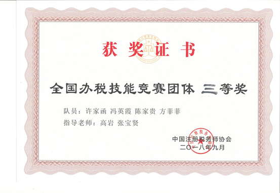 本次大赛历时3个多月,beat365会计学院积极组织学生参赛,参赛学生人数超过200人,通过会计、税法、办税实务等课程、实操模块的系统学习和训练,72人取得“全国办税技能竞赛能手证书”,100余人取得“全国办税技能竞赛合格证书”,经过激烈角逐,从11万余名报名参赛选手中脱颖而出,成功杀入团体组决赛。由会计学院高岩、张宝贤两位老师带队,许佳函、陈家贵、冯英霞、方菲菲等4名大三学生组成参赛团体组,全程参加了大赛,尤其在抢答环节表现优异,获得了团体三等奖。