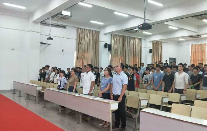首先,全体起立并奏唱国歌。随后,主持人工管1602班潘迦甸同学宣布2018届毕业生欢送会正式开始。