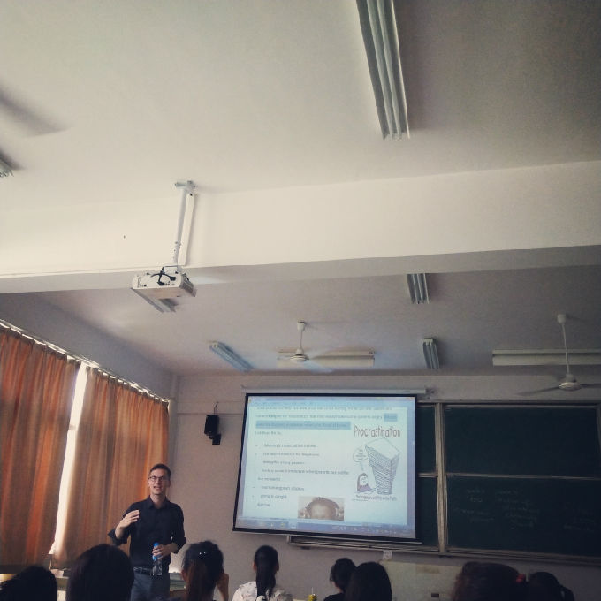 最后一个课题任务是活学活用。Jesse教了大家十个新单词,boisterous, docile, diffident, forward, obnoxious, brat, rebel, spoiled, mature, tomboy. 这些单词都跟孩子的特性有关。在单词讲解之后,Jesse给大家布置了一项小任务,要求每个人用所学的新单词,写一篇关于关于自己小时候的趣事的小短文。然后Jesse向大家分享了他的童年趣事,引得大家哈哈大笑,课堂气氛非常活跃。